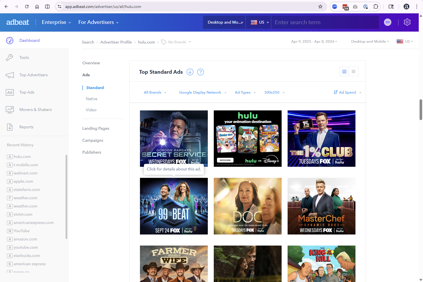 - Identify the Biggest SpendersSee which advertisers already spend a significant amount of money with similar vendors, but not with you. By seeing their exact ad creatives, landing pages, and ad spend, you can develop a pitch that's guaranteed to seal the deal.